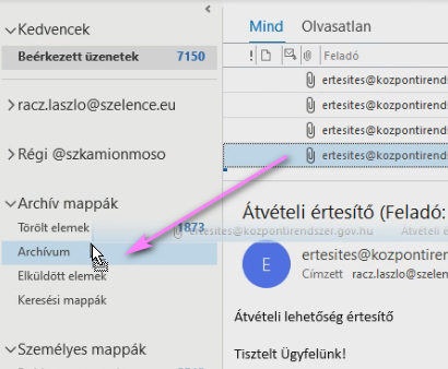 Kézzel is bármikor áthúzhatunk egy vagy több levelet közvetlenül az Archív mappák helyi postafiókba: