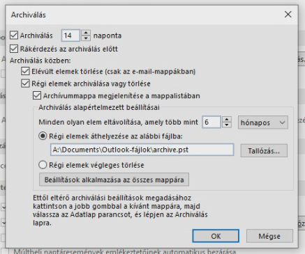 Az képen megadhatjuk, hogy milyen gyakorisággal archiválja az Outlook a régi fájlokat: