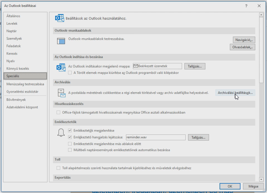 Nyist meg az következő képernyőt: Fájl → Beállítások → Speciális → Archiválási beállítások...