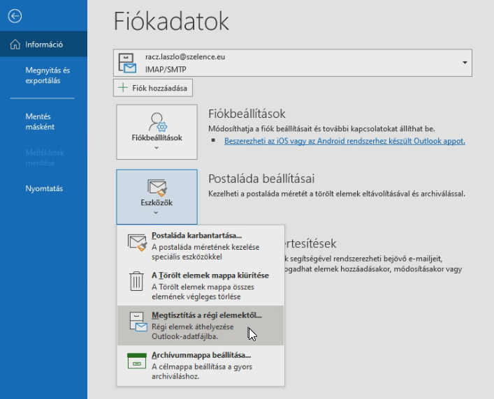 Ehhez használjuk a Fájl → Információ → Eszközök → Megtisztítás a régi elemektől... funkciót: